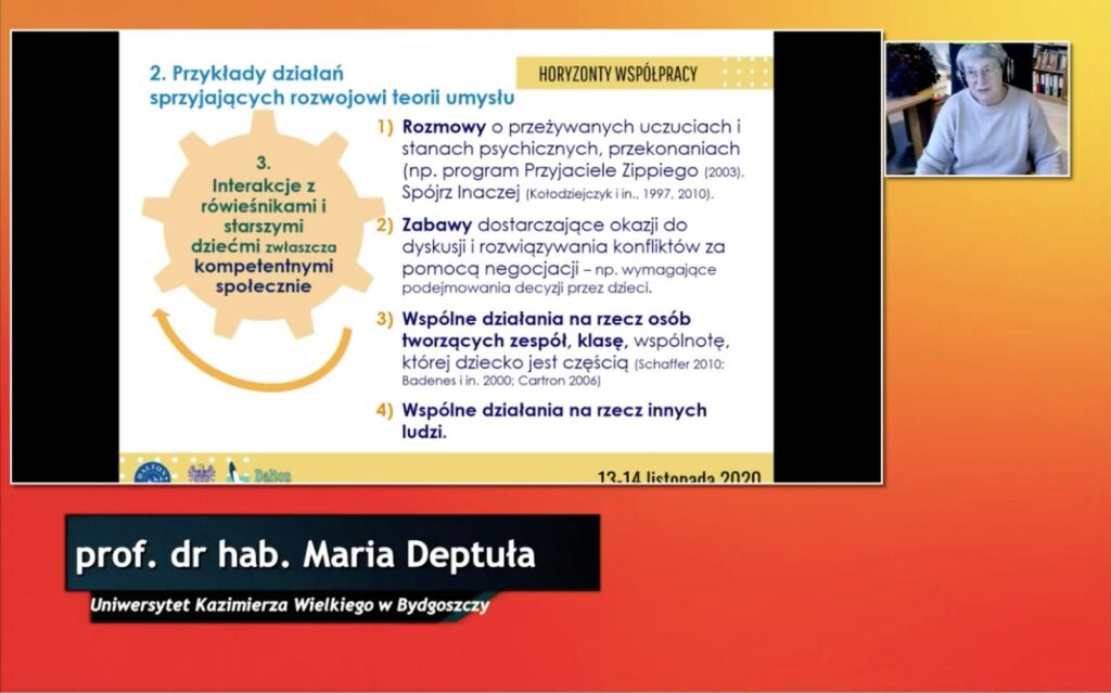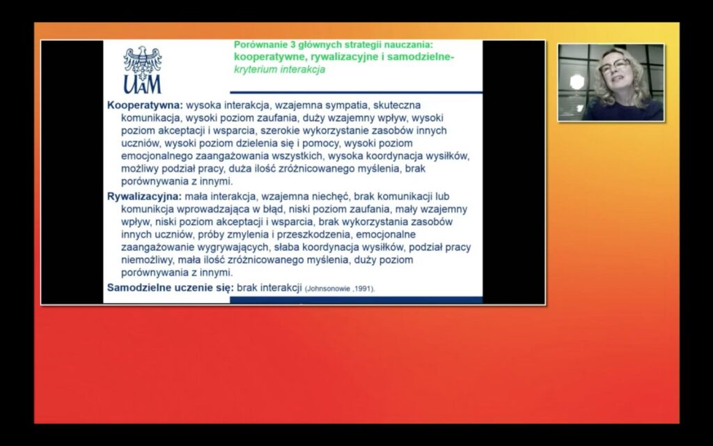 Na temat warunków sprzyjających rozwojowi współpracy w klasach 4-6 szkoły mówiła prof. dr hab. Maria Deptuła z Uniwersytetu im. Kazimierza Wielkiego w Bydgoszczy, która podkreśliła znaczenie warunków sprzyjających powstawaniu motywacji do współpracy. Problem budowania wspólnoty edukacyjnej oraz związanych z tym wyzwań omówił prof. UAM dr hab. Waldemar Segiet z Uniwersytetu im. A. Mickiewicza w Poznaniu, który odniósł się do tematu w ujęciu filozoficznym. Niezwykle aktualny temat technologii informacyjno-komunikacyjne w edukacji jako narzędzia współpracy omówiła prof. UAM dr hab. Natalia Walter z Uniwersytetu im. A. Mickiewicza w Poznaniu. Prof. Walter poruszyła temat inteligencji cyfrowej oraz bardzo aktualne zagadnienia nawiązujące do zdalnej edukacji oraz funkcjonowania w tym zakresie zarówno uczniów jak i nauczycieli.