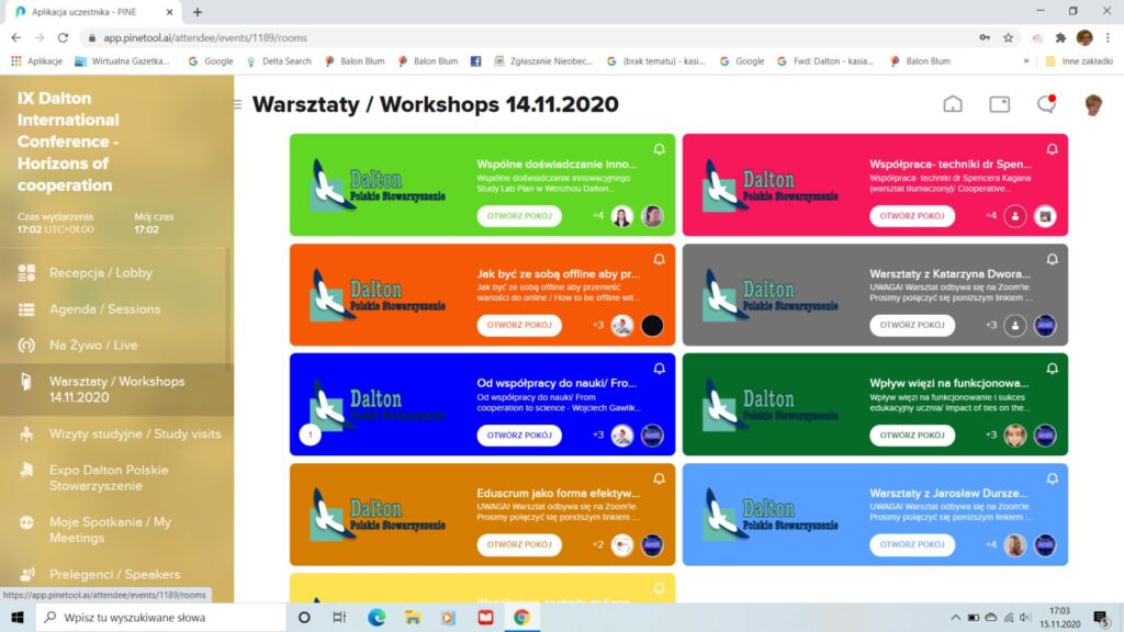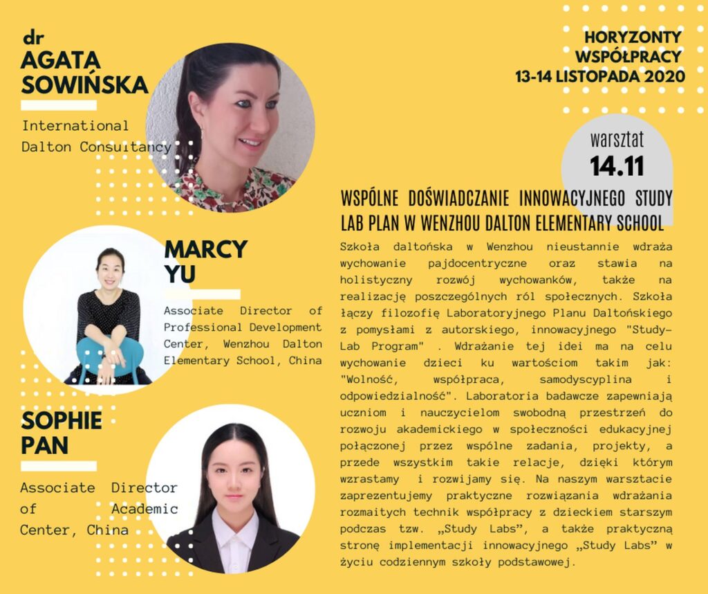 Drugiego dnia konferencji, w sobotę, odbyły się warsztaty on-line. Uczestnicy mieli możliwość wzięcia udziału w warsztatach tłumaczonych na język polski i prowadzonych w języku angielskim. Wspólnym doświadczeniem innowacyjnego Study Lab Plan w Wenzhou podzieliły się dr Agata Sowińska z Dalton International i Sophie Pan, Associate Director of Academic Center oraz Marcy Yu, Associate. Techniki Spencera Kagana zaprezentował Paul Bruijn z Dalton International z Holandii. Natomiast Wojciech Gawlik z EDU-klaster w jednym z warsztatów zastanawiał się w jaki sposób przenieść wartości z sytuacji offline do online a podczas drugiego spotkania pokazał sposoby na przejście od współpracy do nauki. Dużą atrakcją dla wszystkich była prezentacja ze Szkoły Daltońskiej w Australii. Szkoła w Ascham o blisko stuletniej tradycji nauczania Planem Daltońskim zaprezentowała rozbudowaną, zabytkową infrastrukturę szkolną połączoną z internatem oraz przedstawiła swój program pracy w oparciu o Plan Daltoński z uwzględnieniem podstawy programowej.