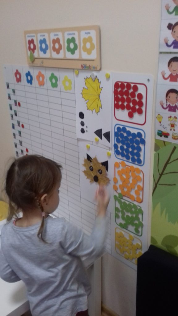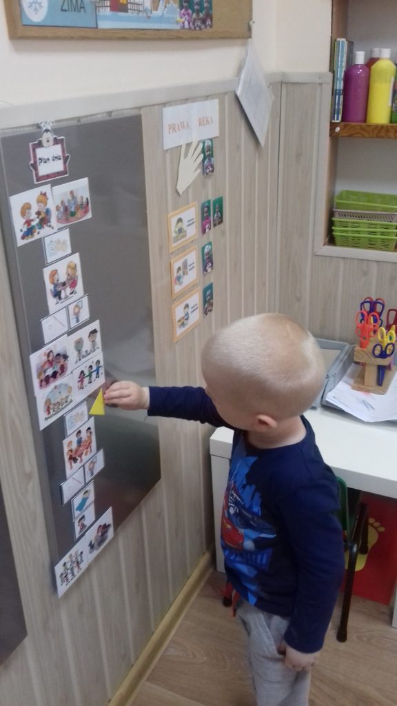 Każdego dnia rano przedszkolaki, po wejściu do klasy, zaznaczają na tablicy magnetycznej swoją obecność, przekładają zdjęcie z tablicy z obrazkiem domu pod obrazek przedszkola. Dzięki tej czynności dzieci uczą się obowiązkowości.