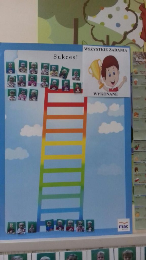 Co poniedziałek też, na tablicy znajduje się zadanie, które dzieci powinny wykonać do końca tygodnia. Proponujemy jedno lub dwa zadania. Dzień wykonania pracy zaznaczają magnesem w odpowiednim kolorze. Sukces dziecka wizualizujemy na „drabinie sukcesu”. Dla naszych maluchów jest to motywacja do działania. Wyrażają radość, gdy ich zdjęcie znajduje się na najwyższym szczeblu drabinki.