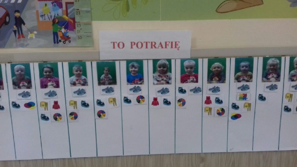 W naszej sali jest także tablica „To potrafię”. Pod zdjęciem każdego dziecka zamieszczamy obrazki ilustrujące opanowane czynności z zakresu samoobsługi oraz inne umiejętności, np. znajomość kolorów, układanie puzzli, liczenie.